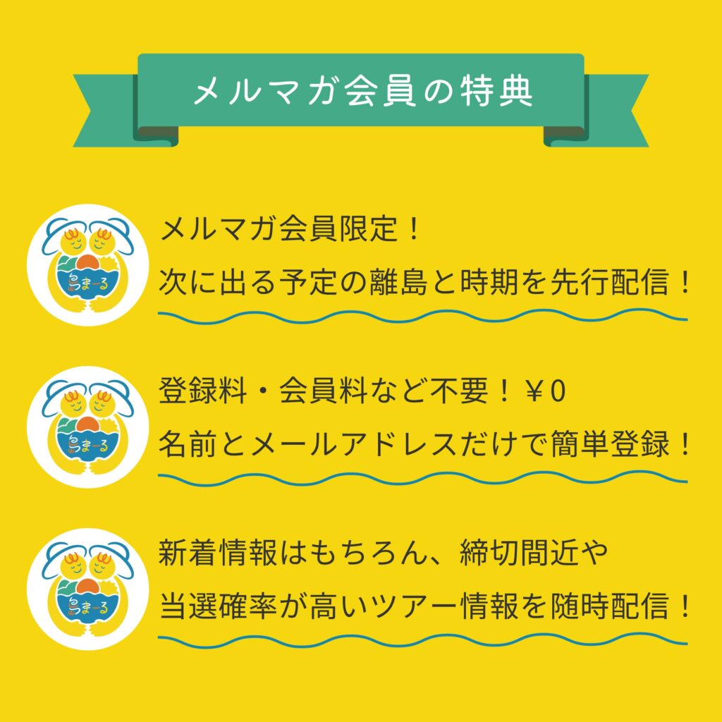 島まーるメールマガジンは約週1回のペースで、最新ツアーや離島情報など、サポーターの皆さまが知りたい情報をお届けしています^ ^♪