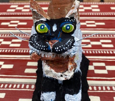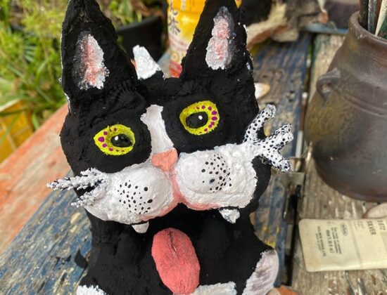 沖縄のシーサー作りになぞり、ネコサーは昔ながらのやり方で作っています。地域猫たちの健康を祈願する想いをのせて作ったネコサーは地域猫専用のトイレの上に鎮座しています。
