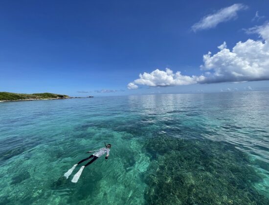 カヤマ島でシュノーケルをしながら、サンゴの本来の色、姿を知っていただきます。