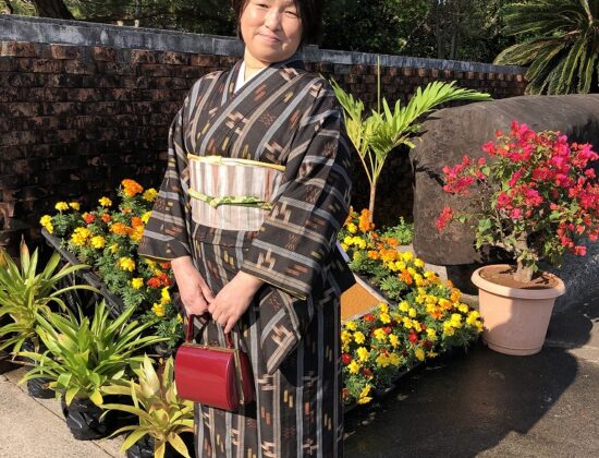国指定重要無形文化財の「久米島紬」を着用してユイマール館でのクルーズ船通訳ボランティア(英語またはフランス語)や